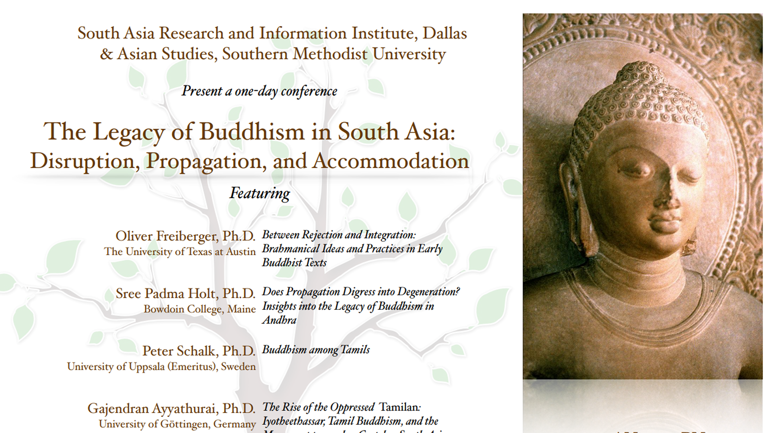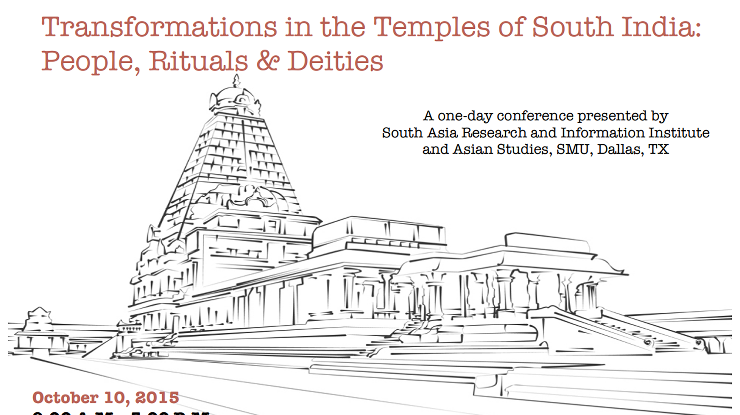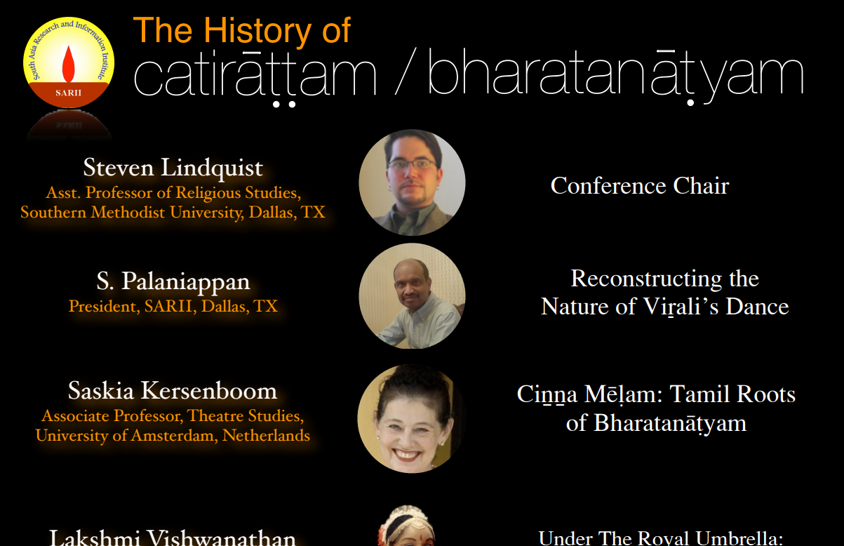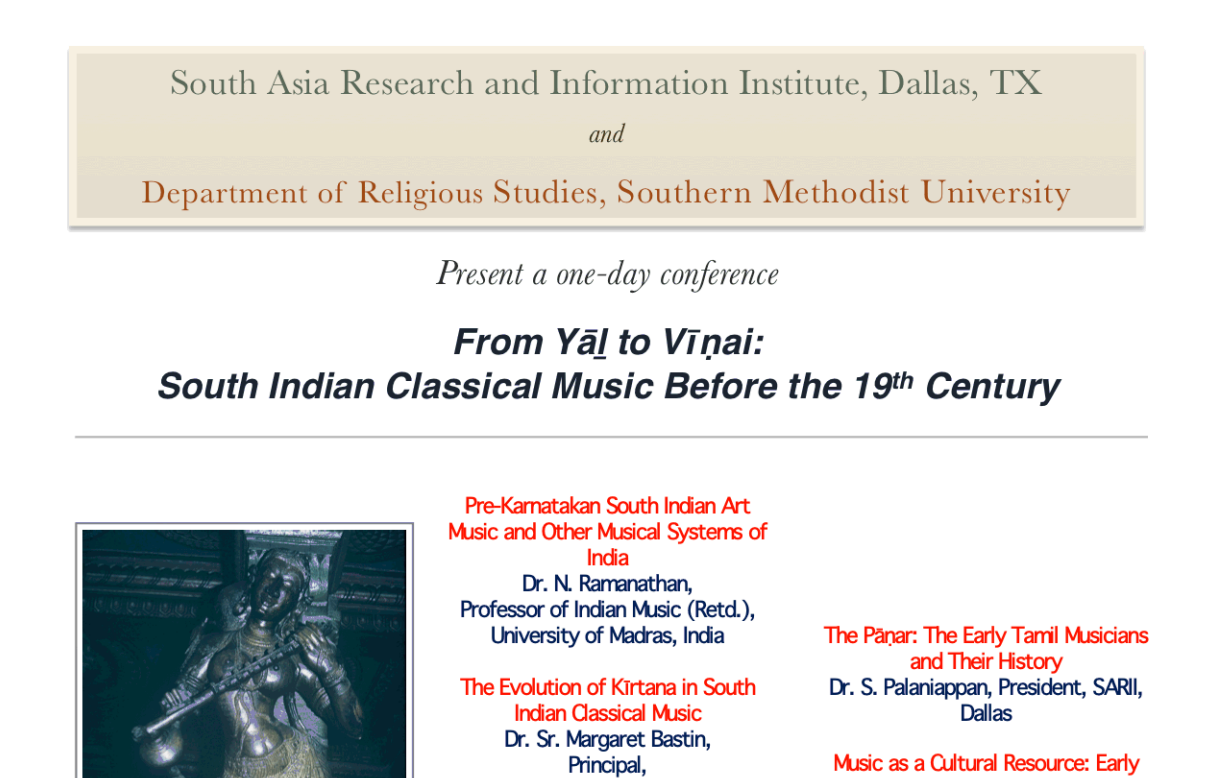 SARII Past Events 2017 Conference Abstracts and Bios October 10, 2015 - Transformations in the Temples of South India: People, Rituals, and Deities September 28, 2013 - Conversion, Caste, and Coexistence: Christianity in South India October 9, 2010 - From Yāḻ to Vīṇai: South Indian Classical Music Before the 19th Century September 22, 2007 - History of Catirattam/Bharatanatyam 2017 SMU Event Details July 4, 2015 - Tamil Music and Musicians September 22, 2012 - Cities, Courts, and Saints: Muslim Cultures of South Asia September 19, 2009 - Tamils in Sri Lanka : Rethinking Political Futures April 29, 2006 - The Bhakti Movement and Society October 1, 2016 - The Legacy of Buddhism in South Asia: Disruption, Propagation, and Accommodation September 6, 2014 - Affirmative Action in Higher Education in India September 24, 2011 - Alternative Rāmāyaṇas: Variations in an Epic Tradition September 20, 2008 - Jainism in South India